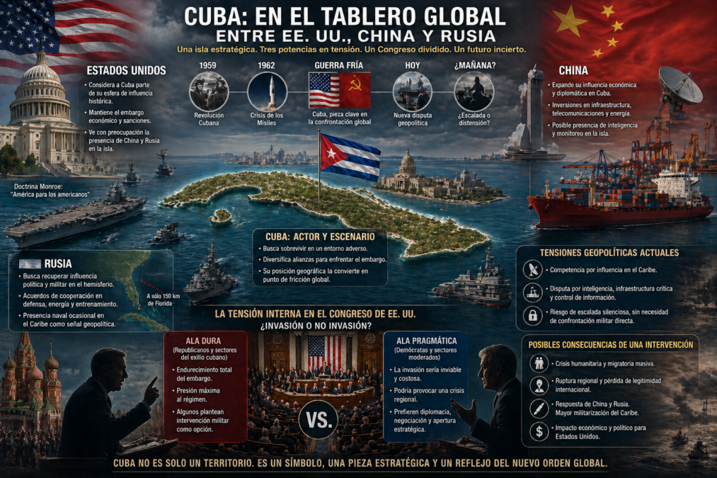 La posición de Cuba en el tablero internacional nunca ha sido estática: es una isla que, por su escala geográfica, parecería marginal, pero cuya carga simbólica y estratégica la mantiene en el centro de tensiones globales. Hoy, en un escenario marcado por la rivalidad entre Estados Unidos, China y Rusia, Cuba reaparece como un punto de fricción donde se cruzan historia, geopolítica y disputa por influencia.